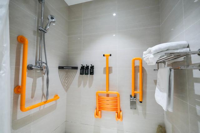 上海景苑水庄酒店早在2021年,就完成了10间无障碍“关爱客房”的全面改造,每一处设计都透着看得见的贴心。工作人员介绍,客房卫生间采用零门槛的无高差设计,轮椅进出毫不费力;淋浴区装了折叠式沐浴凳,行动不便者坐着就能洗澡,旁边还配了安全扶手,地砖也做了防滑处理,手持花洒高度能自由调节;就连房门和卫生间门框都特意加宽,轮椅能顺畅通过;电源开关、灯光控制和插座都往下挪了位置,坐着伸手就能碰到;每个床头柜旁还装了紧急呼叫按钮,一按就能直通服务中心,有需求随时能响应。