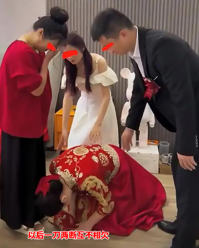 女儿站在那里,眼泪止不住地流,被逼无奈,出门的时候直接跪地,表示自己出嫁后,和娘家一刀两断、互不相欠。女子当时在流泪,亲妈也在流泪,旁人却是一头雾水,女子心里更多是对亲情的绝望。